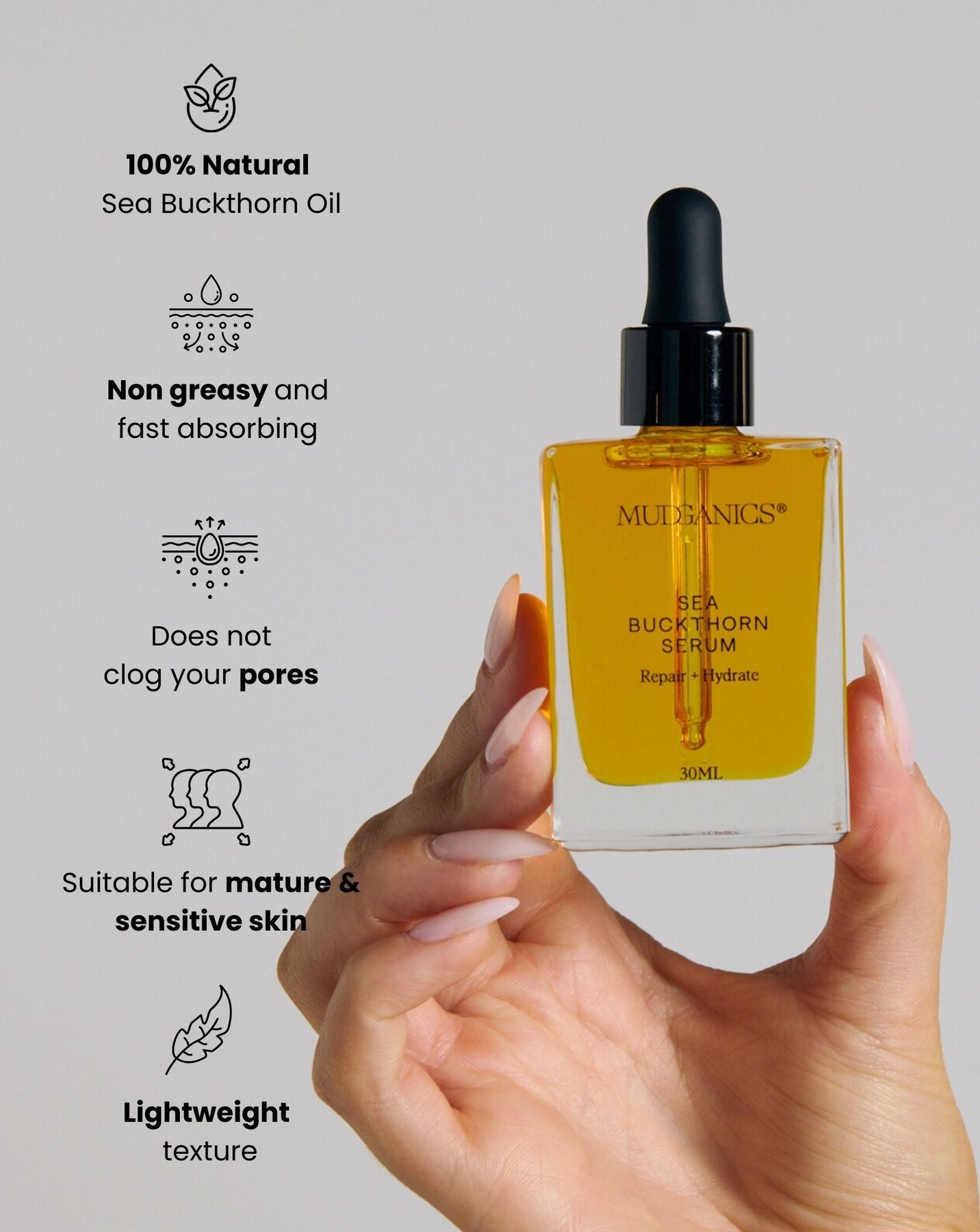 You can use our Sea Buckthorn Serum after a Mud mask or add it to your evening routine. Wash and cleanse your face and add a couple of drops to your night cream or apply directly to your face. And no, the potent orange colour will not stain your skin.